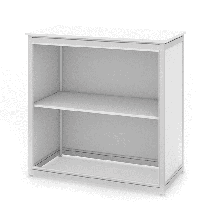 Systemtheke: quaderförmig, Rückseite offen. Maße: 105,4 x 57,2 x 121,6 cm, Arbeitshöhe: 101,6 cm. Gestell aus Aluminium, Füllflächen aus PVC, Stärke: 3 mm, weiß. Arbeits-, Bar- und Einlegeplatte aus KS-Material, Stärke: 16 mm, weiß.
