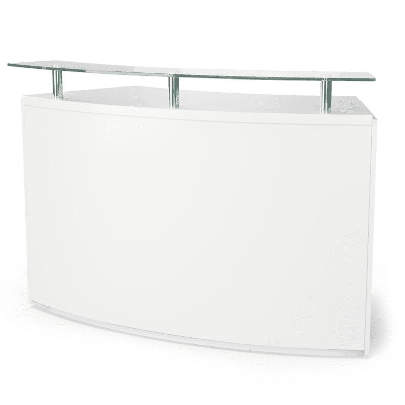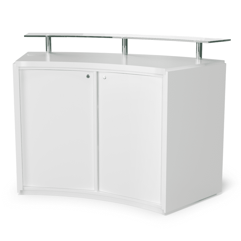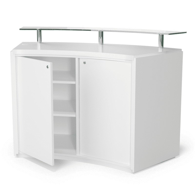 Theke: quaderförmig, Kreisteil, Rückseite mit Türen verschlossen, zwei Einlegeböden pro Element. Maße: 160 x 61 x 110,4 cm, Arbeitshöhe: 96,4 cm. Korpus, Einlegeböden und Türen aus KS-Material, 19 mm, weiß. Arbeitsplatte aus KS-Material, Stärke: 38 mm, weiß. Baraufsatz aus Klarglas (10 mm), auf Edelstahlrohr montiert.