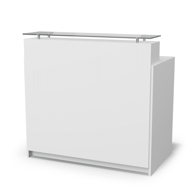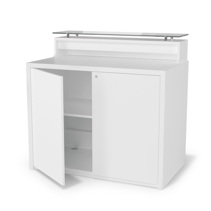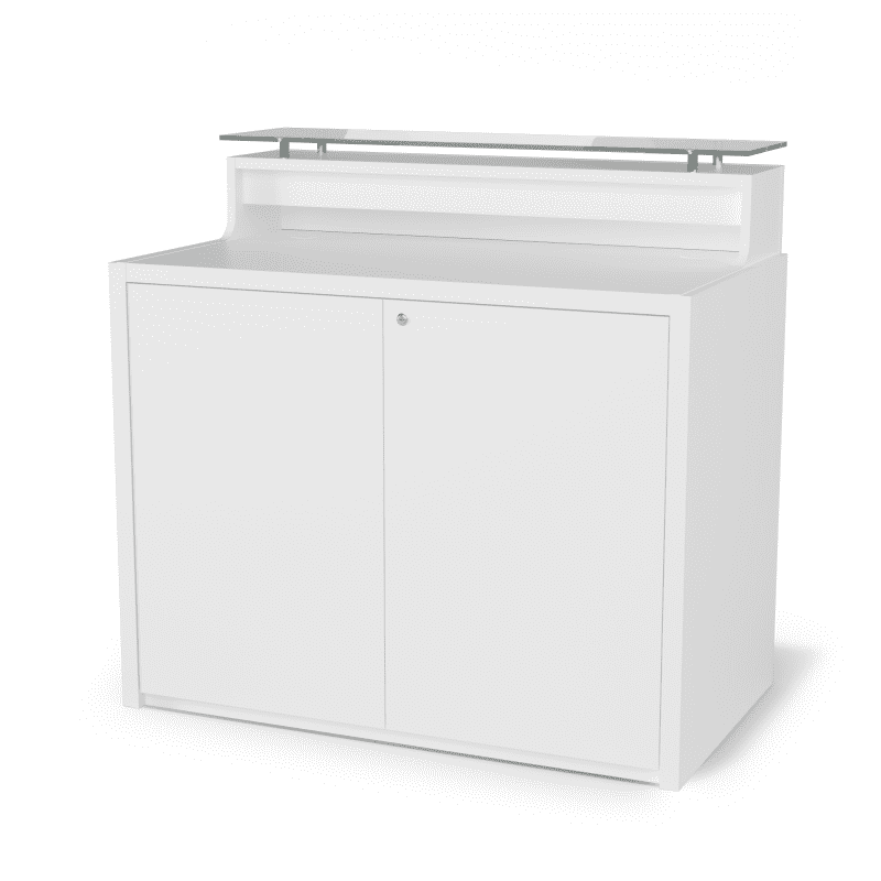 Theke: quaderförmig, Rückseite mit Türen verschlossen, ein Einlegeboden. Maße: 118 x 71 x 119 cm, Arbeitshöhe: 98,4 cm. Korpus, Arbeitsplatte, Einlegeboden und Türen aus KS-Material, 19 mm, weiß. Baraufsatz aus Klarglas (10 mm), auf Edelstahlstützen montiert. Sockel und Barplatte unterleuchtet. Kühlschrankeinbau möglich durch Entfernung des Einlegebodens und der Tür. Thekenfront durch Grafik individualisierbar. Grafikfläche: B x H - 1189 x 1040 mm.