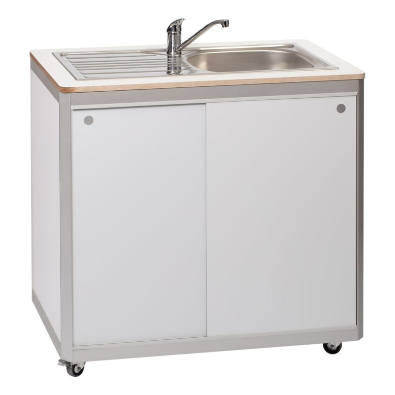 Korpus weiß, mit Schiebetüren und integriertem Boiler, Spüle rechts.